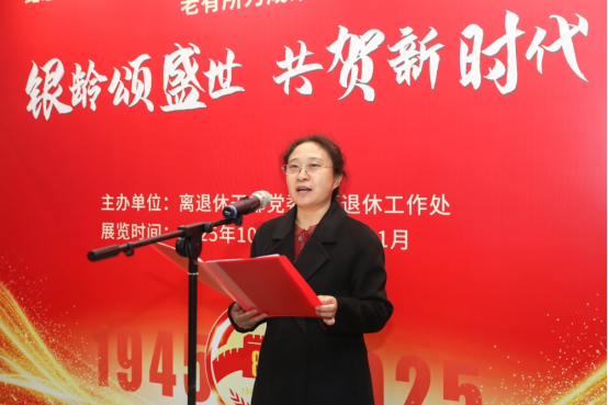 王立艳主持揭幕式。她表示一年一度的老有所为成果展自2008年首办,历经18年的沉淀与升华,已成为校园“润心工程”,希望更多的青年师生来参观交流,从老同志的作品和事迹中汲取成长的力量。